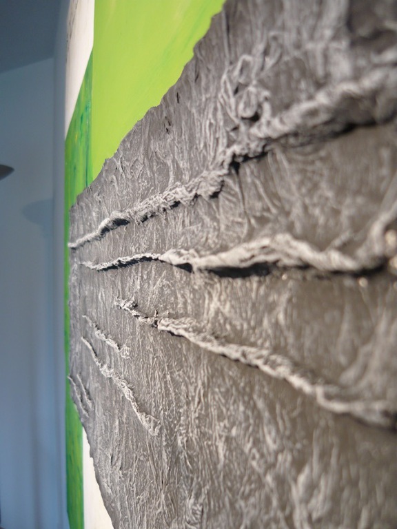 Durch Rissstrukutren lassen sich tieferliegende Farbschichten teilweise freilegen. Je nach Farbwahl der Deck- und Grundschicht können einerseits sehr harmonische Farbspiele oder andererseits sehr markante Farbkontraste erziehlt werden. Zusätzlich enstehen bei diesem Prozess interessante, feine, dreidimensionale Strukutren.